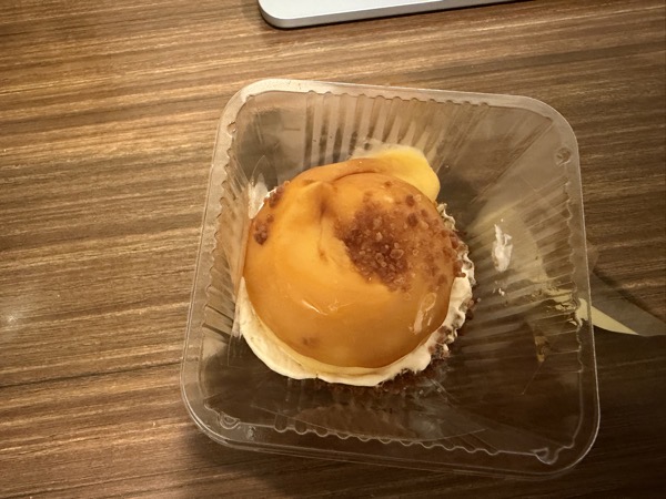 The dessert tasted fine but the structure was weird. It’s a custard tart and the bottom was hard. I couldn’t cut it with the plastic spoon they gave me but I could chew it just fine. Ah whatever. It tasted good.