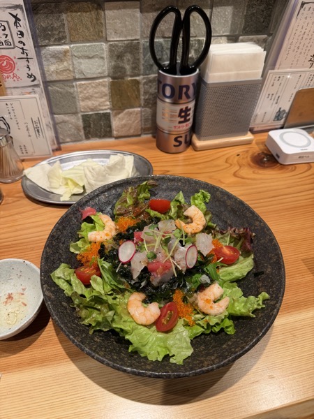 but I came to my senses. I talked to the Tourist desk people and they said the famous local dishes were the Sanuki udon and bone-in chicken. There’s hime (young) and oya (old) chicken and I couldn’t find any of the oya at restaurants with bone-in chicken in the station. I had to go to an izakaya where the sign said you had to have one drink. He said oolong tea counted (it’s a cheat code in Japan for people who don’t drink) and I got that and a kaizen (seafood?) salad.