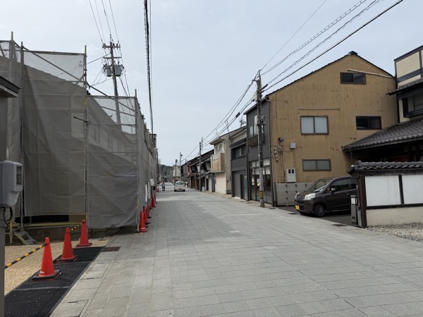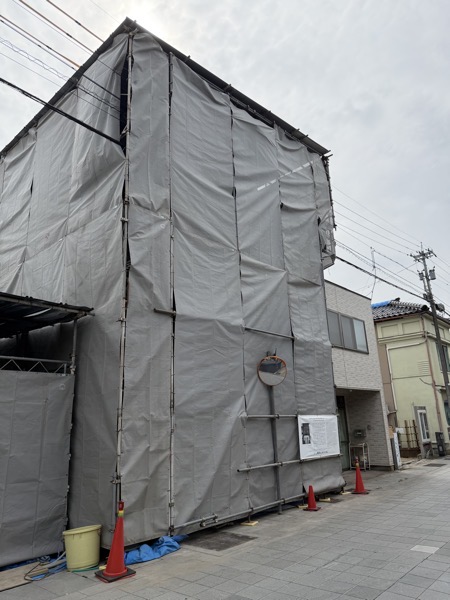 Several historic buildings wrapped in construction cloth. When I read the sign more closely it said they were culturally significant and damaged in the Noto earthquake of 2023.