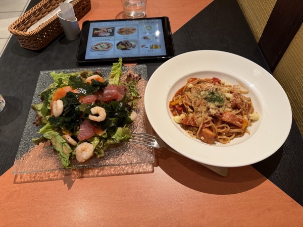 I asked where they got the salmon for the salmon pasta and confirmed it was from overseas. I felt OK getting a Napolitan spaghetti instead of seafood. I got a seafood salad (I know, I’m an idiot) which had more tuna and salmon sashimi than most mains I’ve had. But it the fish seemed rubbery compared to the buttery smooth fresh-caught fish I had at lunch. It was fine. It seemed expensive at ¥3025 but that’s $19.00. Less than what I pay for a burger and fries at a lot of places.